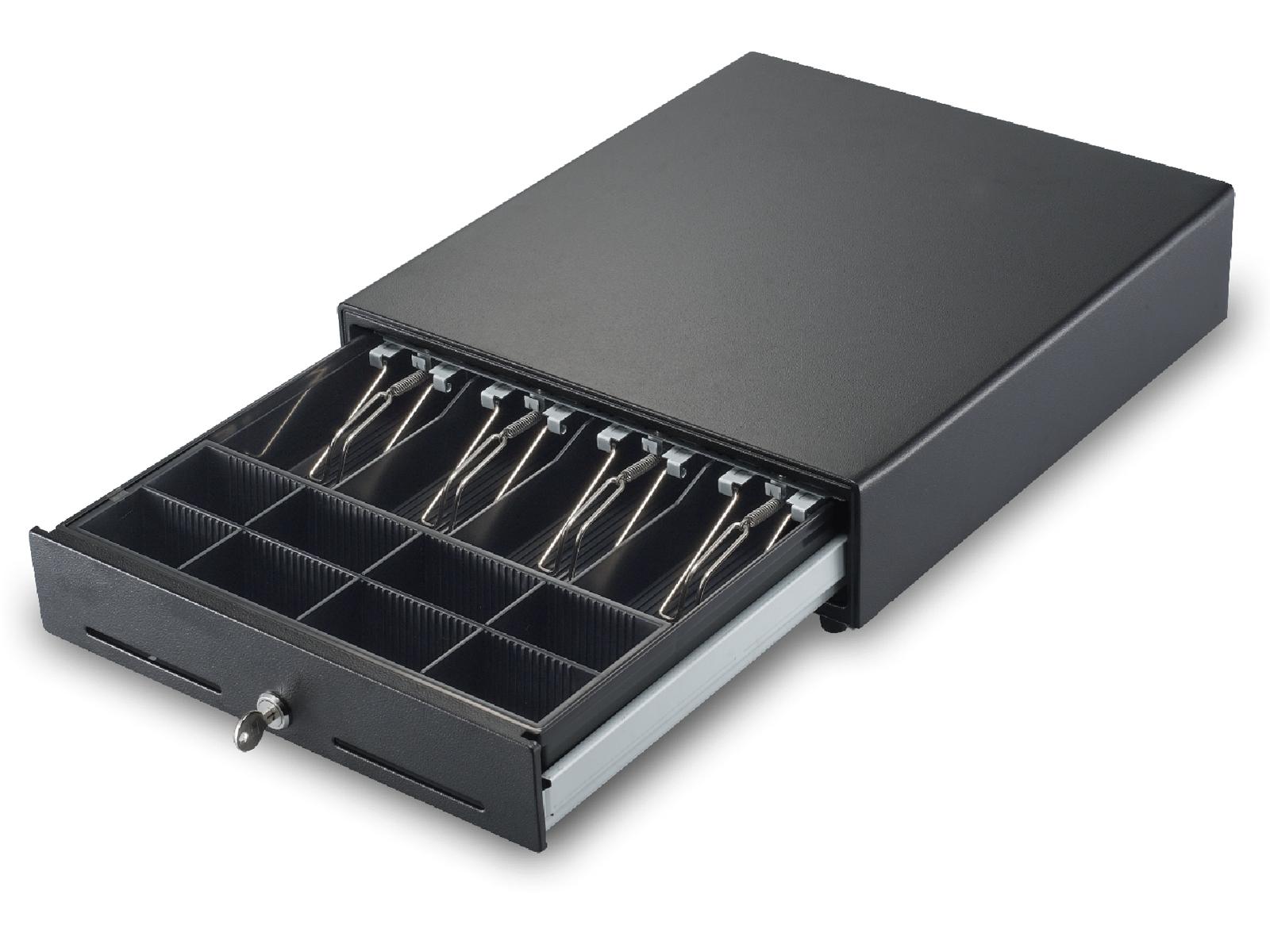 Reliable & popular metal cash drawer, fast open with ball bearing rollers, removable money tray & coin case, adjustable bill & coin divider.
